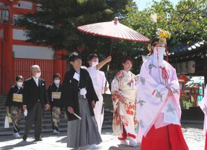 祝を意味する雅楽の演奏で、境内の石畳を進み神殿へ向かいます。