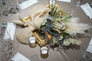 各卓の装花はブーケを寝かせたようなこだわりスタイル!