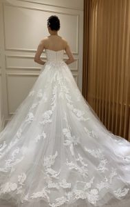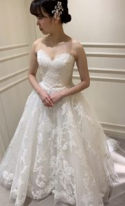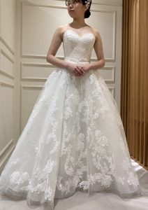 チュールを何層にも重ね、ボリュームのあるスカートにはカットレースの上にホワイトビジューがあしらわれているこちらのお衣裳は、花嫁様の表情をより明るく魅せてくれます。