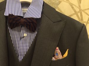 またブルーチェックシャツにイエローのポケットチーフを差し色に加えることで