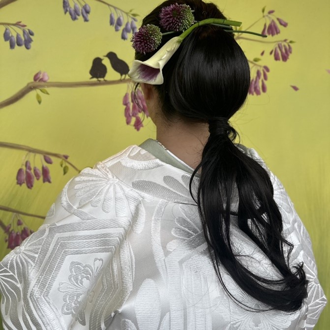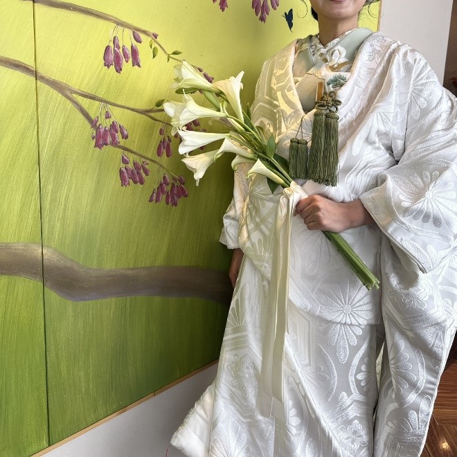 和装スタイルにぴったりなユリとカラーとうお花を使用した