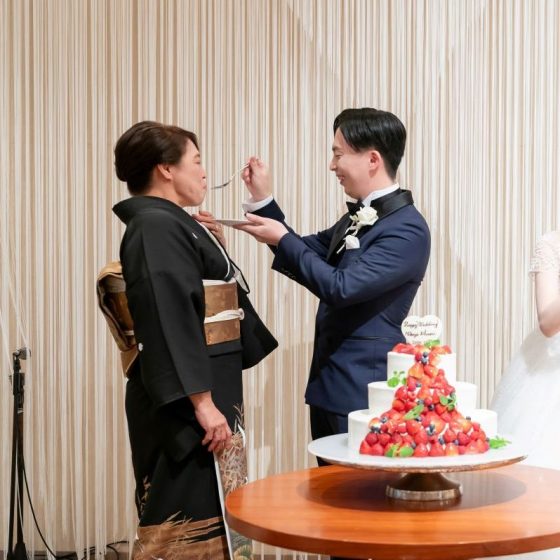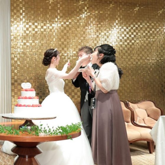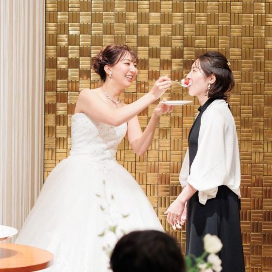 ウェディングケーキを食べさせるというゲスト参加型の演出です
