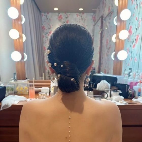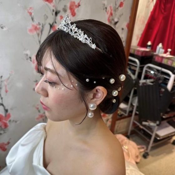 パールをヘアアクセサリーとして使用すると上品な印象に。