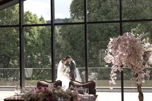 お過ごしいただきたいという想いも含め 会場のお花は季節花の桜を選ばれました。
