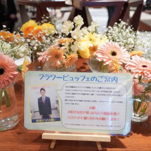 こちらのおふたりは新郎様が新婦様にサプライズでお渡しになるフラワーバスケットをゲストの皆様にお作りいただきました
