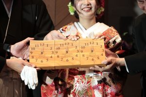 新婦様のお手紙に続けて、大切な親御様に感謝の想いを込めて記念品をお渡しするシーンです。