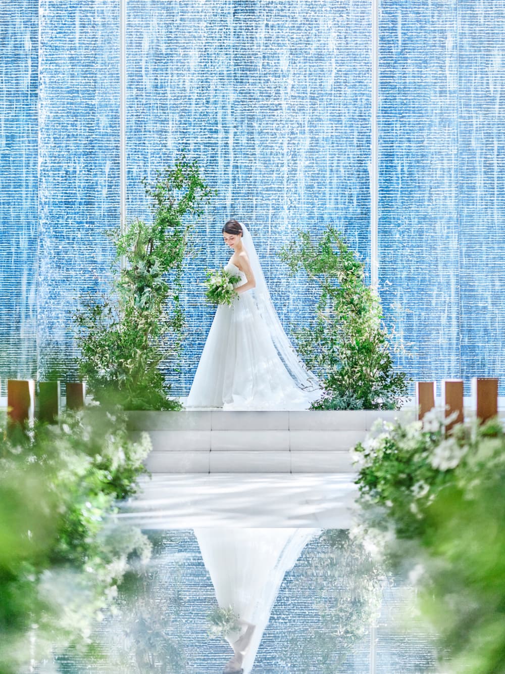 チャペルの祭壇の奥、一面のガラス窓の先には上空から清らかな滝が降り注いでいます。吹き抜けの空間から差し込む自然光は水の流れに反射し、おふたりの最高の瞬間をより一層美しく輝かせます。天候に関わらず明るい自然光が満ちる美しい空間の中で、神聖なセレモニーを叶えていただけます。