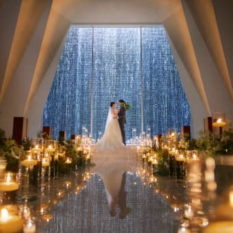 KOTOWA 京都 八坂のチャペルは、柔らかな光と純白の空間に包まれた空間。 高い天井と、祭壇の先の吹き抜けから降り注ぐ自然光、 そして流れ落ちる滝水のきらめきが、おふたりの姿を美しく引き立てます。 心地よい緊張感に包まれながら、大切なゲストの方々と、祝福に満ちた誓いのひと時をお過ごしください。