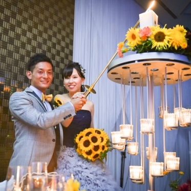 こだわりポイント1つ目はなんといってもヒマワリ!2人の1番好きな花で、夏ということもあり、ブーケはもちろん会場のお花も様々な種類のヒマワリを取り入れてもらいました。