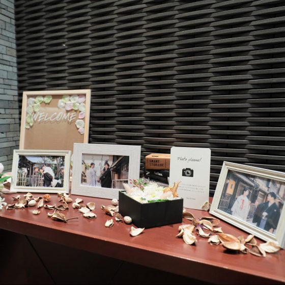 席札のプラ板をゲスト1人1人に手作りしました。そのため、待合室でウォールレターを設置して、座席表も加えることにしました。司会者の乾條さんから引出物に席札をつけていただくように案内していただき、お見送りの時にゲストの方の引き出物にそれぞれ名前がついているのがすごく嬉しかったです。