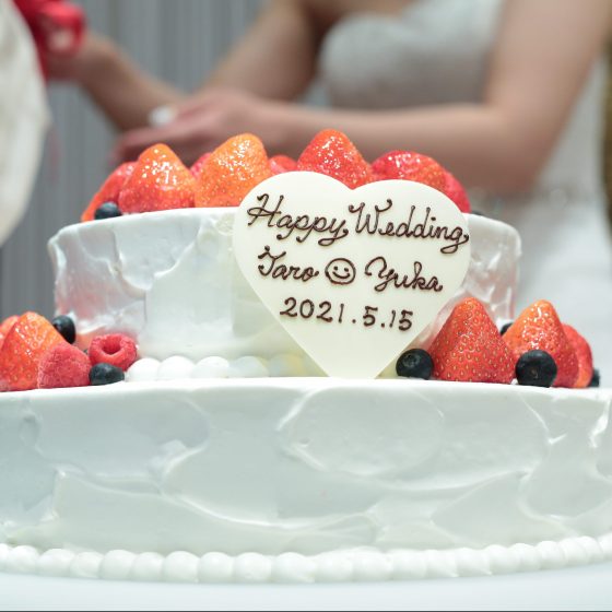 思い出の打ち合わせは、ウェディングケーキです。コロナ禍の為オンラインでの打ち合わせとなり、顔を直接合わすことができず、とても寂しい思いでしたが、そんなことでは屈しないぞ!とばかりの笑顔の真美さん。そんな真美さんにつられて新郎もケーキ選びにこだわりを発揮しました。何段のケーキにするか、いちごのケーキがいいけど、他のフルーツも入れるのかなどおおまかなことだけではなく、粉糖はかけるのか、クリームはどんな搾り方のするのか、チョコプレートの色は?等、自分たちではわからないことを全部聞いていただき、とても満足のケーキが当日待っていました。