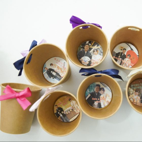フラワーシャワーの紙コップの中に、コメントを書いた前撮りの写真を貼って、花びらがなくなったら写真が見えるというのは、ずっと前から考えていて、頑張って作って良かったです。