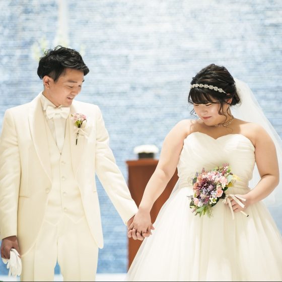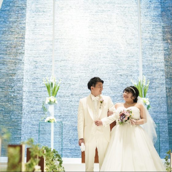 挙式場にあるバックの滝がとても綺麗で天井も高いところが気に入りました。
