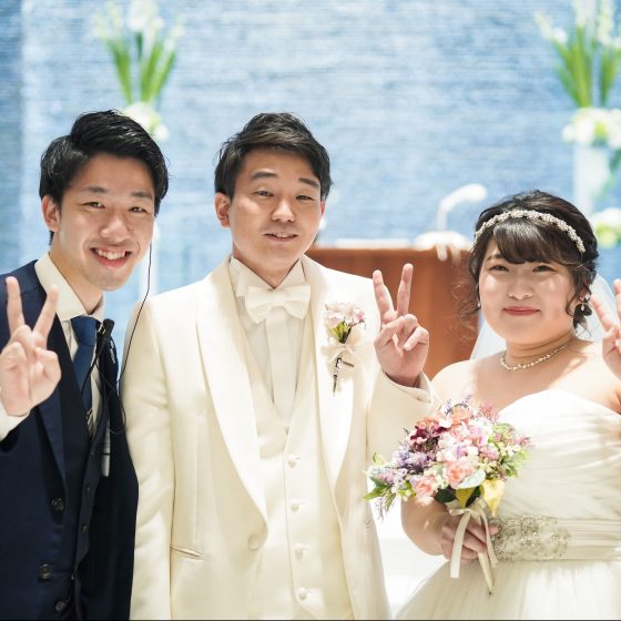 挙式場にあるバックの滝がとても綺麗で天井も高いところが気に入りました。