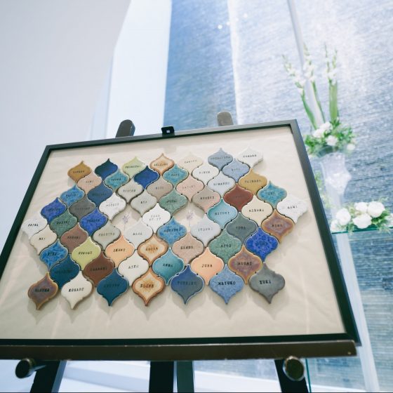 席次表をエスコートカードにしたり、ゲストのテーブルは壁になってしまうアクリル板を置かない代わりに1テーブルの人数を少なくして、ゲスト同士の距離を開けたり、一人ひとりにコロナ対策グッズを配ったりと、感染対策を徹底した中でも、ゲストが式を楽しんでもらえるように考えました。