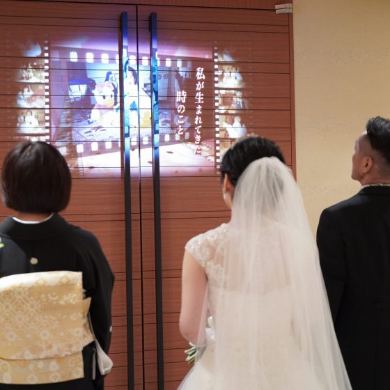 チャペルに入場する前に、新婦と新婦の両親と思い出のムービーを見たり、