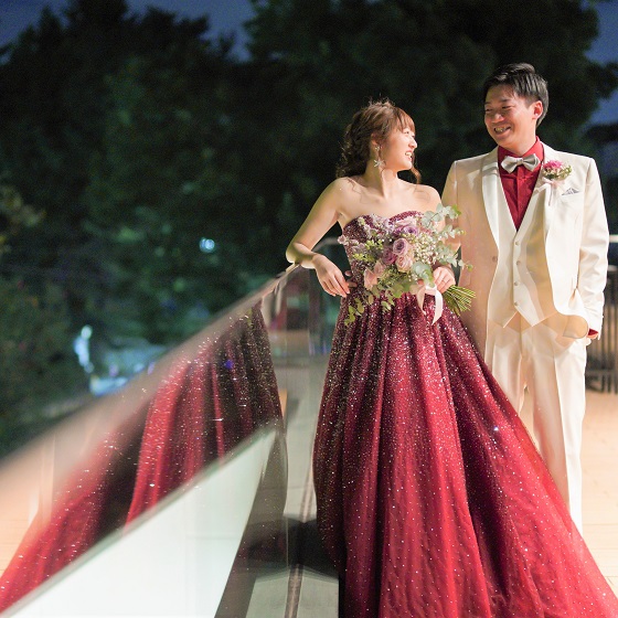 小さな頃から大きなリボンがついたドレスに憧れていたので、ウエディングドレスは即決でした。カラードレスは何度もドレスショップに行き、たくさん試着した中でキラキラのたくさんついた華やかなドレスに出会うことができました。新郎のタキシードの中のシャツは、ドレスと同じ赤色のシャツでリングコーデにしました。