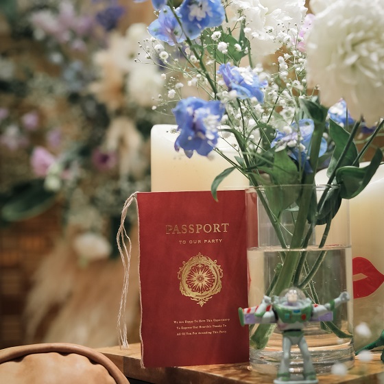 まず、招待状から旅行テイストにして席札は紙ヒコーキにメッセージ、テーブル札は空港コード、席次表はパスポート風に、披露宴会場入場からイミグレーションスタンプ・搭乗にあたっての注意事項の演出など、いかにもゲストの方が旅行しにきたような空間に仕上げました。