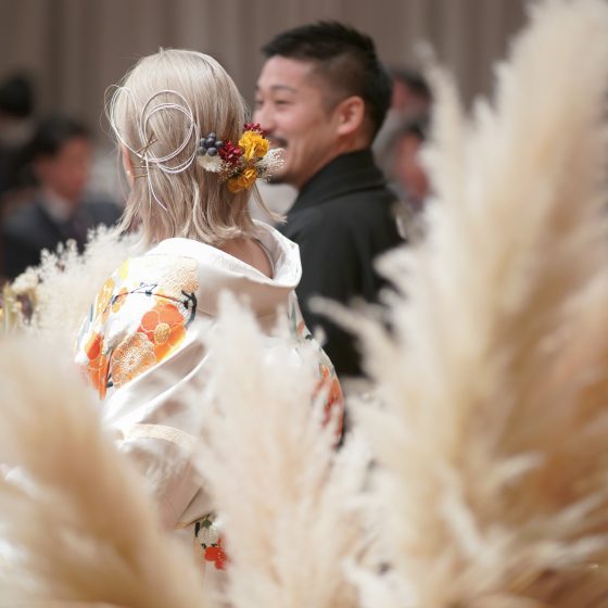 披露宴に向けて髪色をハイトーンにしたので、ピアスや髪飾りをボリュームのあるものにして、首周りはシンプルにした所がポイントです。