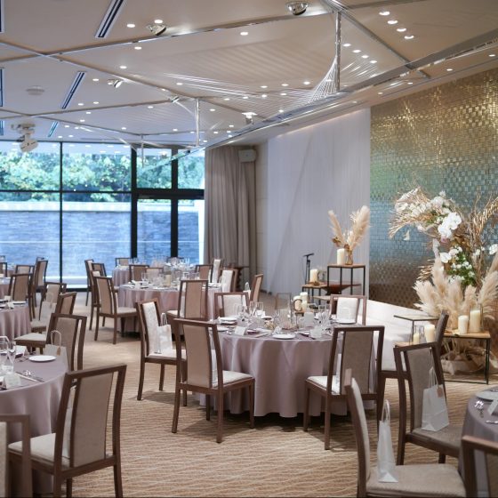 披露宴会場AYANEのバックのゴールドがとても素敵だったので、全体的にテーブルクロスやお花、招待状など、シャンパンゴールド系で統一し特別感を演出しました。