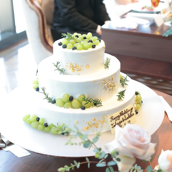 こだわった部分は装花やドレスなど沢山ありますが、食事とお酒は絶対に良いものをと思っていたので、コースを決める際には結構悩みました。打ち合わせの際に、シェフにも相談に乗っていただきながら、最終的に納得のいくコースにすることが出来ました。もう一点こだわった点はウェディングケーキです。オーダーメイドで注文が出来たので、フルーツの置き方から金箔の貼り方までこちらで決めさせていただきましたが、当日出来上がったケーキが想像通りでとても嬉しかったです!たくさん注文をしてしまって申し訳なかったかなと思っていましたが、当日のケーキを見て、細かいところまでこだわって良かったと思うことが出来ました。