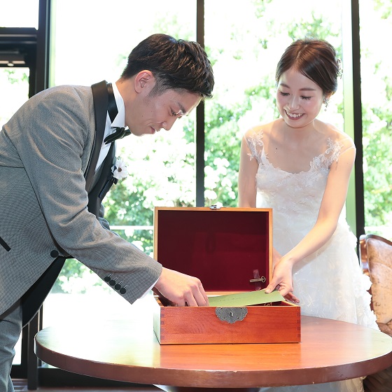 ゲストに楽しんでほしいという思いがあったので、ゲストが参加できるようなイベントを考えました。その中でも、ゲストから10年後の新郎新婦に向けた手紙をボックスに入れてもらい、鍵をかけるウェディングボックスセレモニーを行いました。10年後にそれを開けるのがとても楽しみです!また、テラスを使った演出をしたかったので、デザートブッフェを取り入れ、ゲストがアットホームな雰囲気の中で楽しめるようにしました。