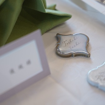 こちらで事前に準備した、モロッカンタイルプレートに、来てくださるゲストの方の名前を印字した、モロッカンプレートをゲストの方にはめ込んでいってもらいました。各卓テーブルラウンドを行い、各卓でお写真を撮り、最後のピースは担当プランナーの西村さんにはめ込んでもらう為サプライズで準備をしており、呼び出してはめてもらって完成した時は、すごく感動しました。