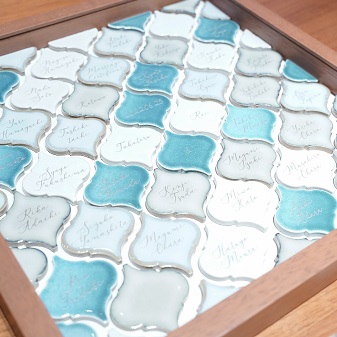 こちらで事前に準備した、モロッカンタイルプレートに、来てくださるゲストの方の名前を印字した、モロッカンプレートをゲストの方にはめ込んでいってもらいました。各卓テーブルラウンドを行い、各卓でお写真を撮り、最後のピースは担当プランナーの西村さんにはめ込んでもらう為サプライズで準備をしており、呼び出してはめてもらって完成した時は、すごく感動しました。