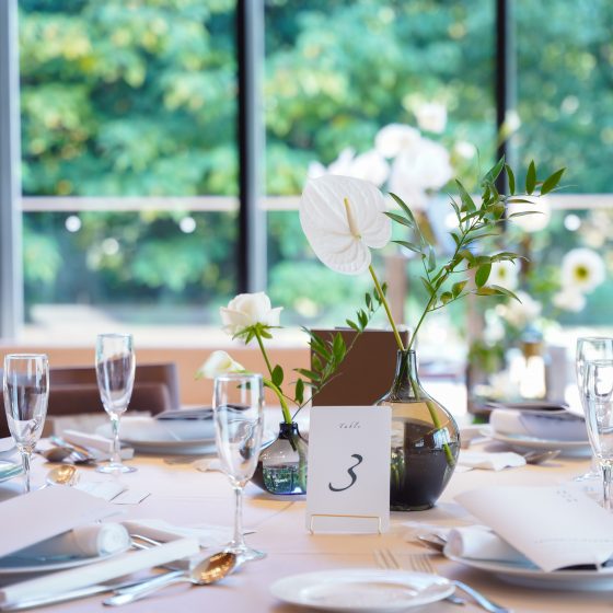 披露宴会場のHARUKAは緑いっぱいのナチュラルな雰囲気で日当たりも良く、テラスもあり開放感があります。