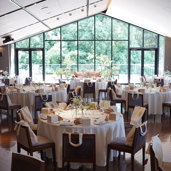 披露宴会場はカーテンを開けると緑が一面に広がり、その美しさにときめきました。暖色系のカラードレスが着たいと思っていたので、自然の緑をバックに素敵な写真が撮れると思いました。天井に映し出される大きなスクリーンは迫力満点で「HARUKA」の会場の魅力でした。