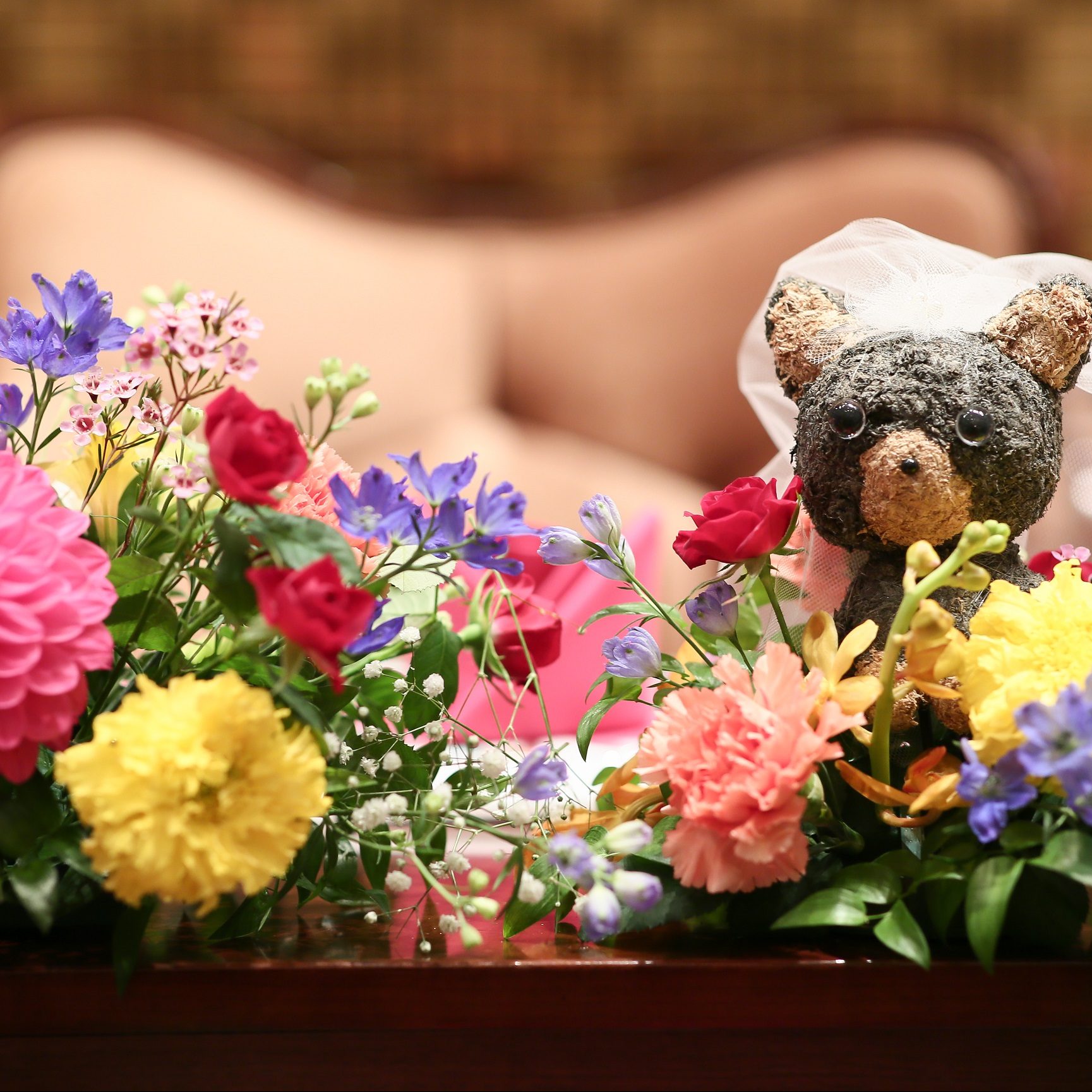 装花やナフキンなど、ビビットカラーでインパクトのあるものを使用しました。装花では高砂にはハッキリした色を、ゲストテーブルにはレインボーローズを取り入れてゲストにぜひ持って帰っていただけるようにしました。本番入場までどのように作って頂いているのかわからないため、とても楽しみにしていましたが、予想を上回る仕上がりにふたりともひたすら感動していました!