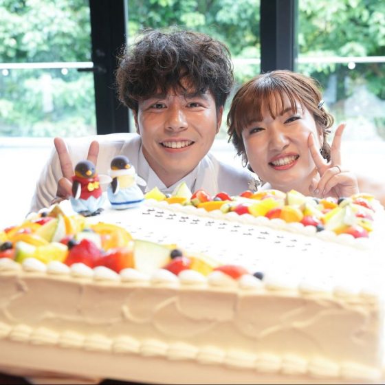 ケーキ入刀はペンギンのトッパーをふたりで付けて完成にしたり