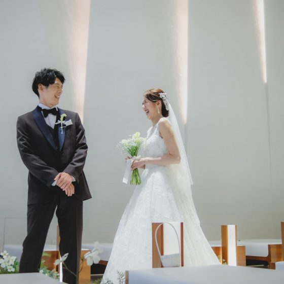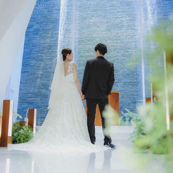 地下にあるとは思えない白く、水の流れているチャペルがとても綺麗で特に新郎が一目惚れしました。また、披露宴会場もいつも参列者として参加している披露宴とは違う形で演出ができ、私たちや参加していただく方全員が楽しく過ごせるのではないかと思いました。見学に行った時もたくさんのサプライズがあり、楽しかったです。大きな窓からグリーンが映えていて、HARUKAの会場が気に入りました。料理も自分たちと料理長と相談して選んでいけるというところも非常に魅力的でした。