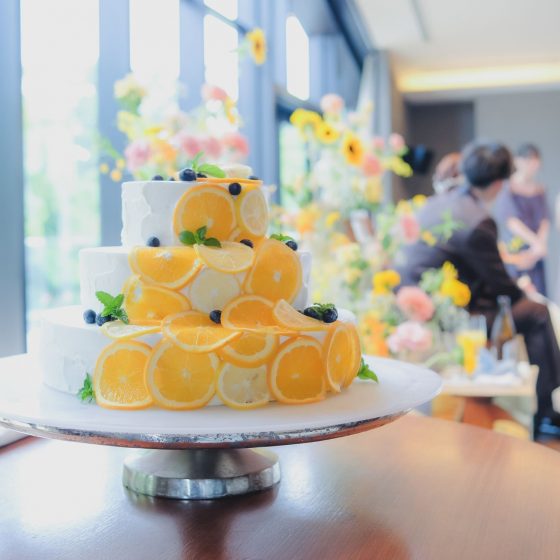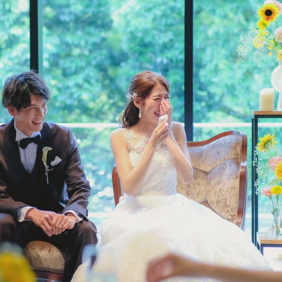 どこのポイントもこだわりが多かったのですが、まずは料理です。2人で参加した試食会が本当に楽しくて一番印象的かも知れません。笑参加者が食べる料理を実際に試食できたり、乾杯者も試飲して決めたりと当日のイメージが湧いたので安心して進めることができました。料理長との打ち合わせもたくさんアドバイスをくださり、自分たちだけのメニューになったので嬉しかったです。お花も夏の雰囲気で向日葵を中心に可愛くしてもらい、ナフキンの形も船にしました!ペーパーアイテムもできるところは自作し、楽しく見てもらえるように工夫しました。