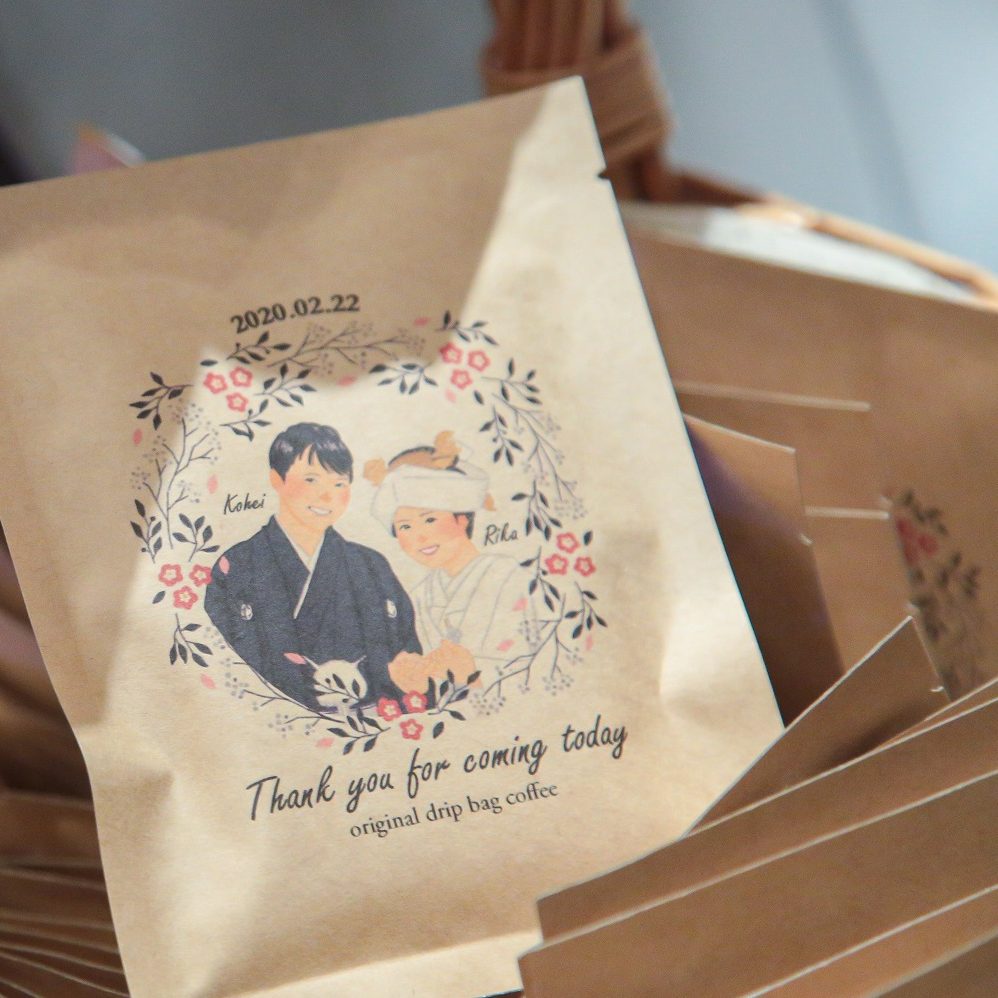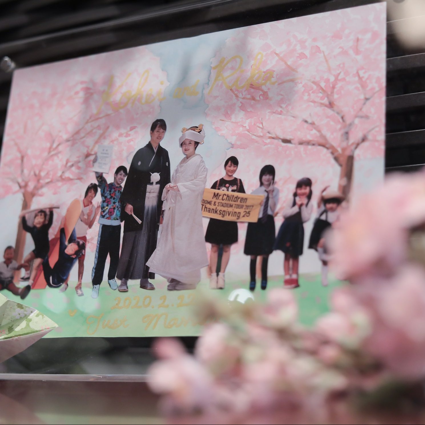 あと、私は手作りが大好きなので、たくさんのグッズを持ち込ませていただきました!幼少期から前撮りまでの写真を桜並木の絵に並べたボード、桜の花びらのシールを貼った和紙風のメッセージカード、ふたりのそれぞれの職場のキャラクターに結婚式衣装を着せたフォトプロップスなど思いついたものを全て作りました。久しぶりに習字道具や絵の具を引っぱり出してきて、準備の時間もとても楽しかったです!