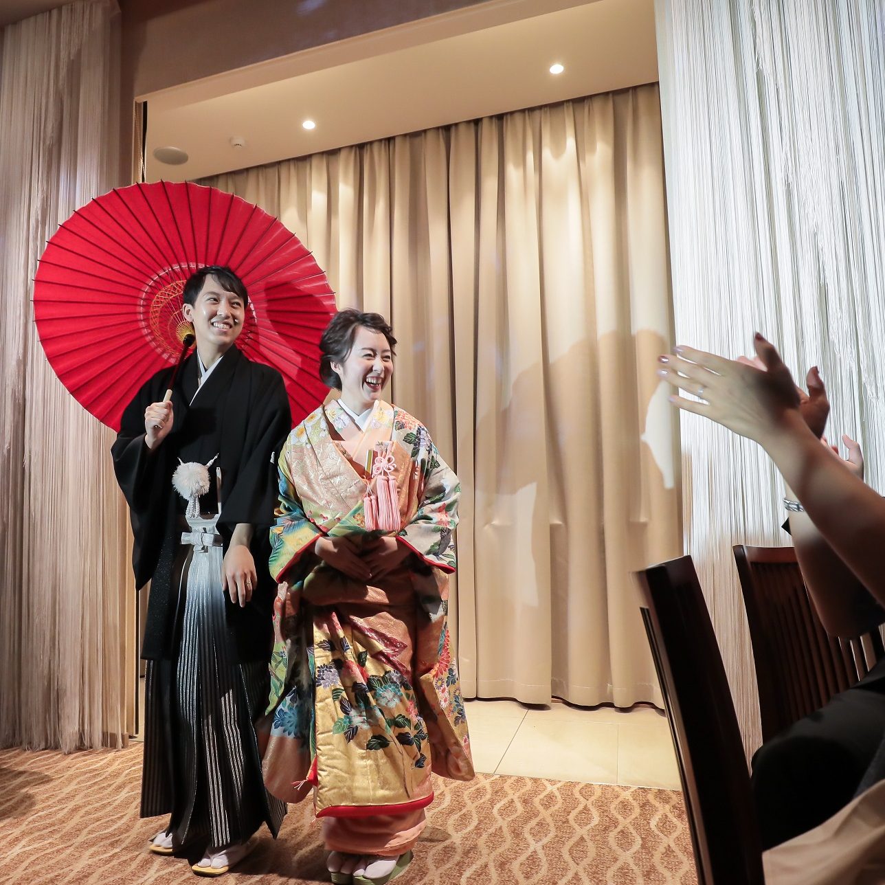 披露宴では、挙式と雰囲気をガラリと変えて、和装で糸カーテンからサプライズ入場!会場は一気に盛り上がり、ゲストの方からは「一番印象に残った瞬間!」と言ってもらえて、とても嬉しかったです!