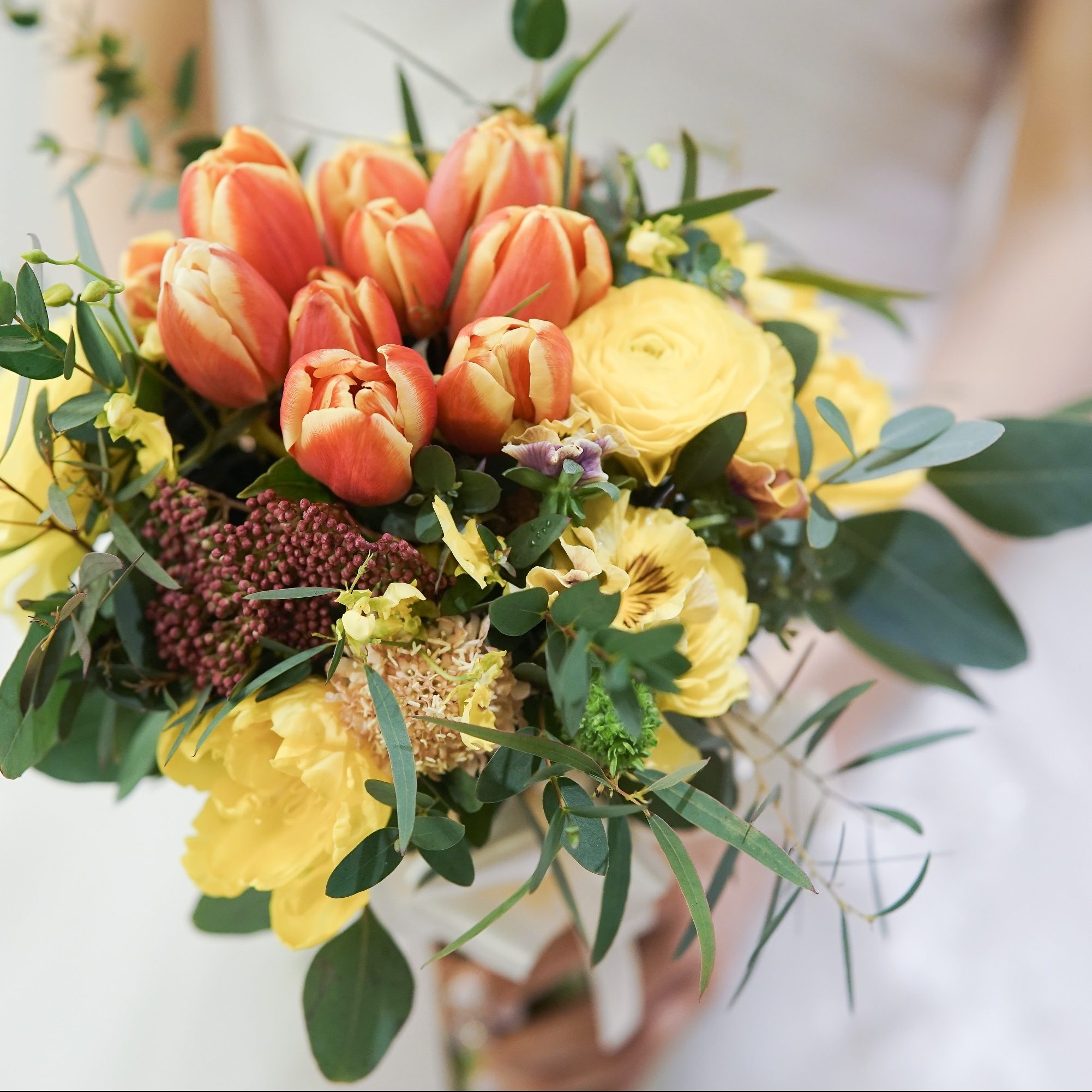 お花:ブーケやメイン・ゲストテーブルに、富山名産の色鮮やかなチューリップを織り交ぜ、ボリュームも増やすことで、春らしい華やかな雰囲気になりました。