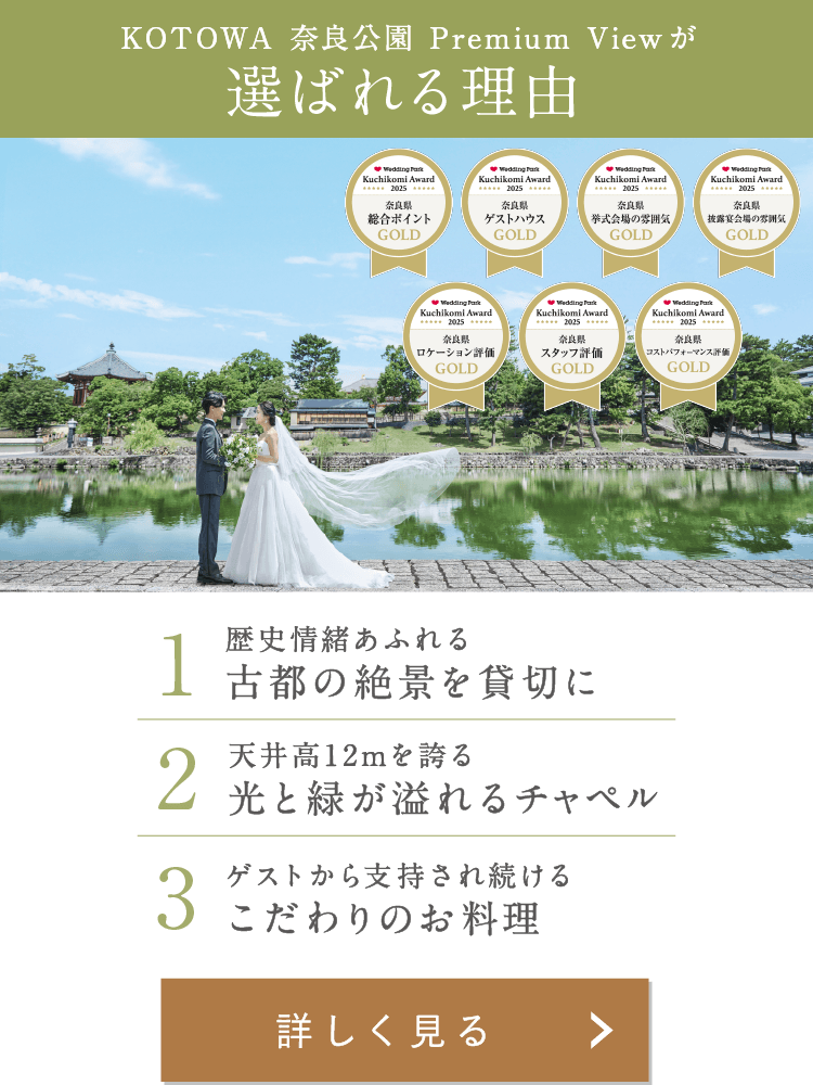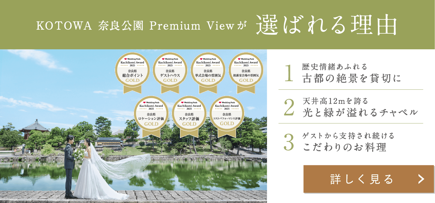 KOTOWA 奈良公園 Premium Viewは、古都の美しい景色の中でおふたりらしさあふれる結婚式を叶えていただける、洗練のウエディングステージです。