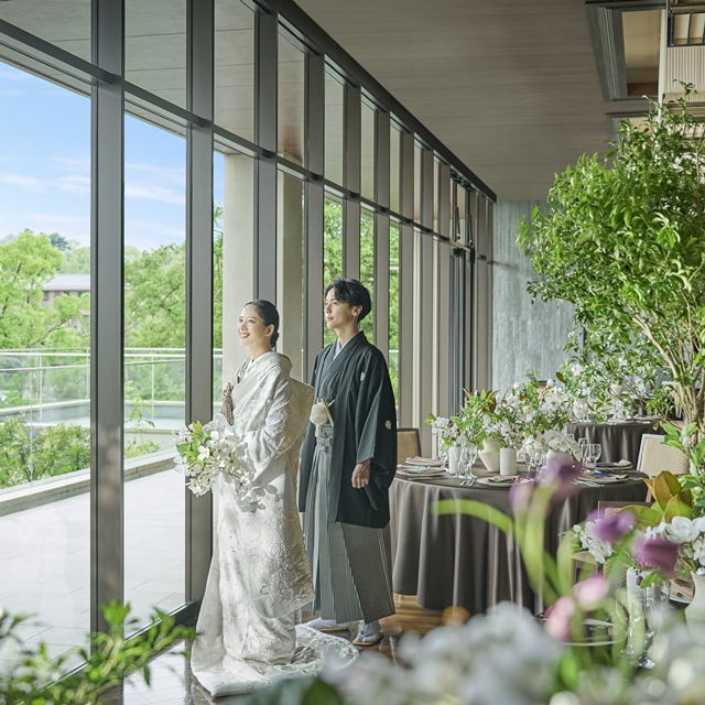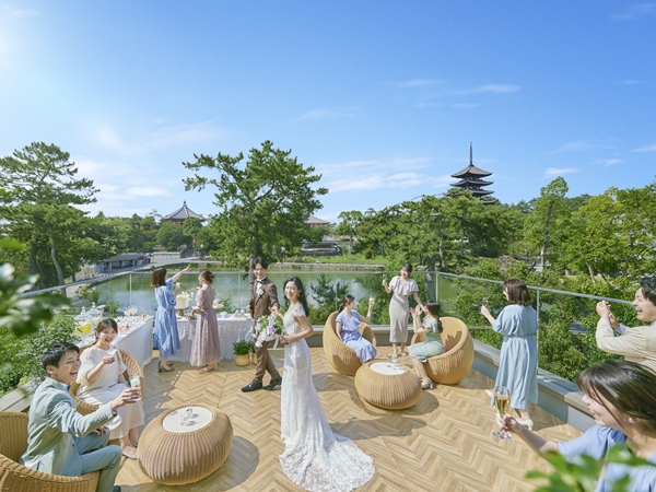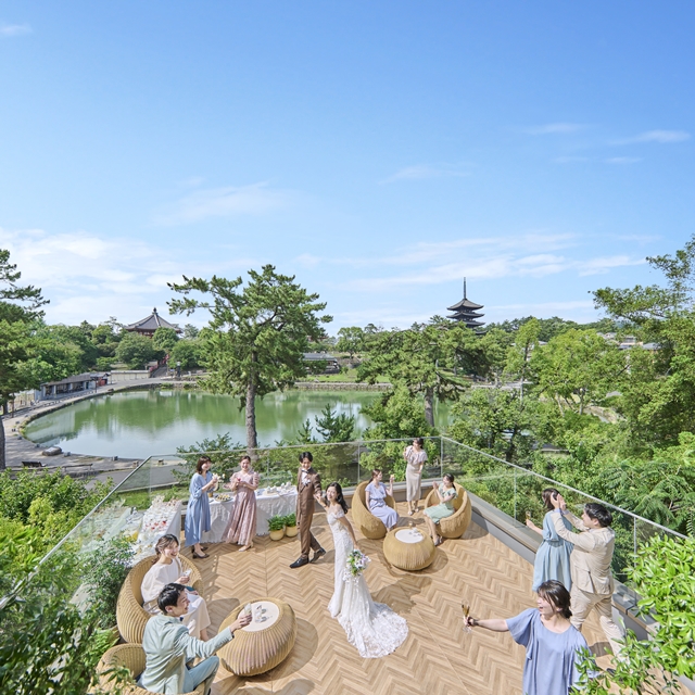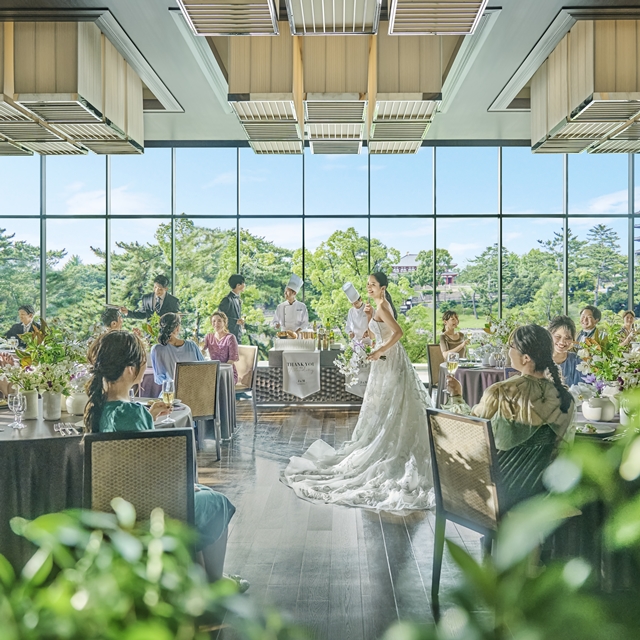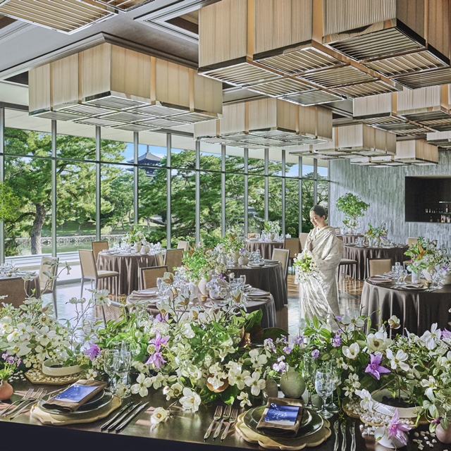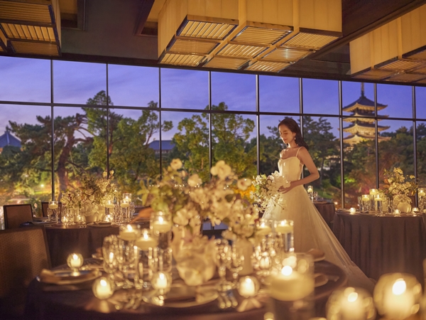 バンケットの窓の外に広がる奈良公園の緑、その向こうには凛とそびえる興福寺。ナイトパーティーも映える「この素晴らしい眺めを、お世話になった人たちに贈りたい」と心から思えるプレミアムビューがゲストをお迎えします。四季折々の風情をたたえた最高の景色に彩られ、人生最幸のひとときを心に刻んでいただけます。