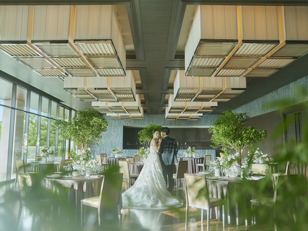 落ち着いた色調の「AKATSUKI」は、ドレスはもちろん、華やかな和装や和風のウエディングアイテムも美しくマッチする会場です。大人の雰囲気漂うモダンなインテリアは、主役であるおふたりをよりスタイリッシュに際立たせてくれます。大切なお一人おひとりと心が通い合う、和やかなパーティーをお愉しみください。