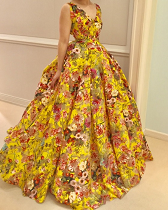 胸元や背中は大きく開いたフェミニンなVカットデザイン。