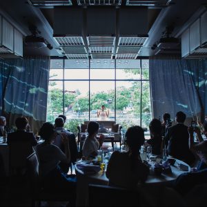 カーテンがバッとあき、五重塔と猿沢池という奈良らしい特別な景色をバックに