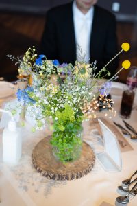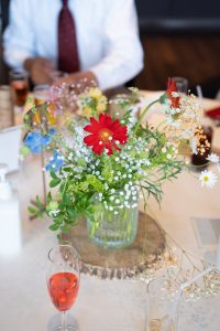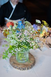 披露宴会場の入り口に彩りが綺麗な装花を準備