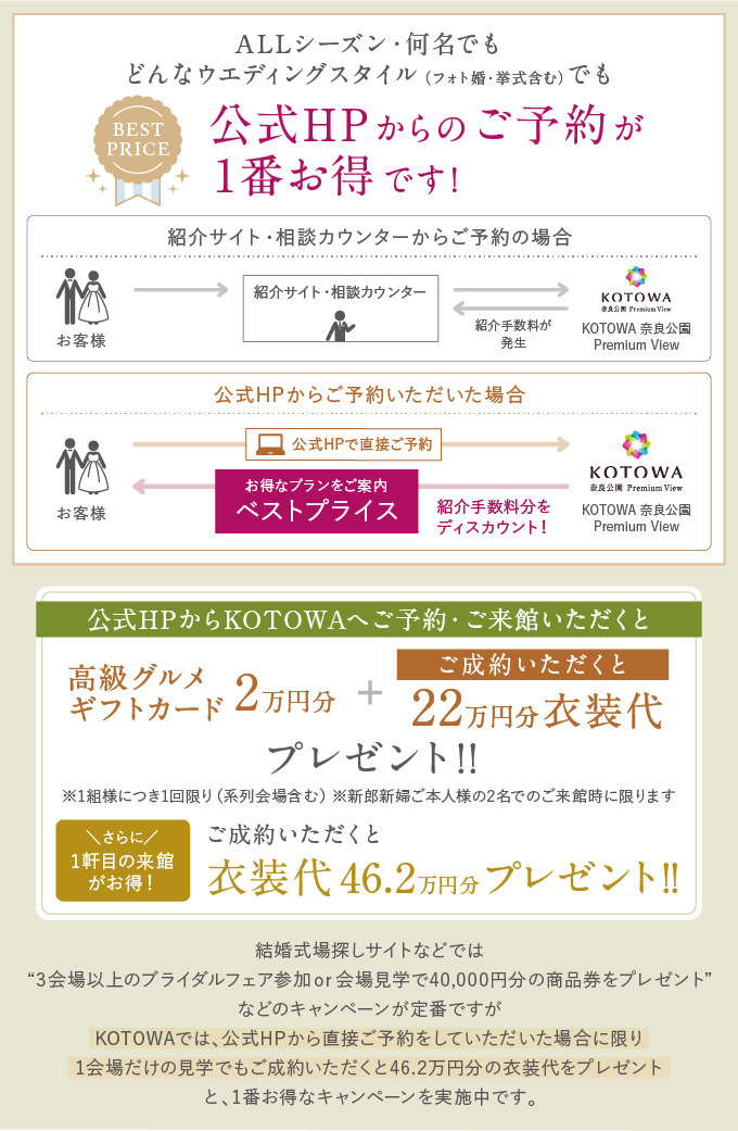 詳しくはブライダルフェアにご参加いただき、ご紹介させていただきますが、ご成約頂くタイミングや、