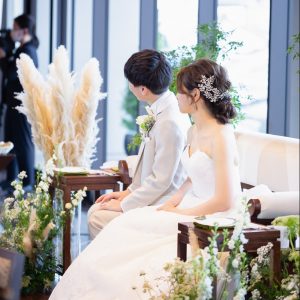 人に恵まれた人生を過ごせたことに感謝を届けたいおふたりは花言葉で「感謝」と表せるかすみ草を取り入れつつ、パンパスやグリーンを多く取り入れた披露宴会場を飾りました。