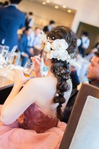 カラードレスのお色味に合わせて、可愛くも大人っぽくも演出できる生花のヘアスタイルは