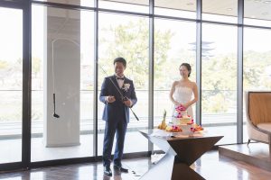 普通のスプーンではなく、釣り竿やおふたりにちなんだものでのファーストバイトは