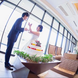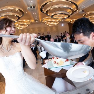 新郎新婦様がお互いにケーキを食べさせ合うシーンですが、新郎様から新婦様には”一生食べ物に困らせません”