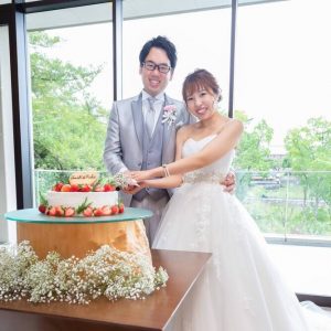 新郎新婦様がお互いにケーキを食べさせ合うシーンですが、新郎様から新婦様には”一生食べ物に困らせません”