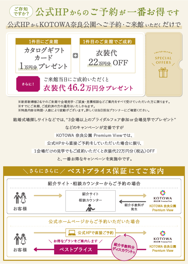 他の式場紹介サイトや式場紹介デスク・相談カウンター経由にてご予約をいただく場合よりも